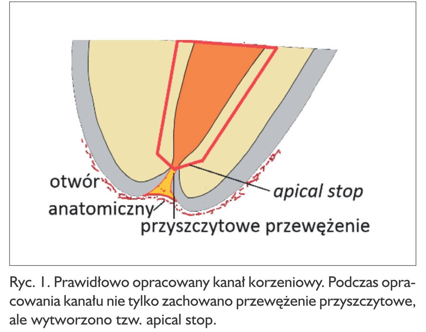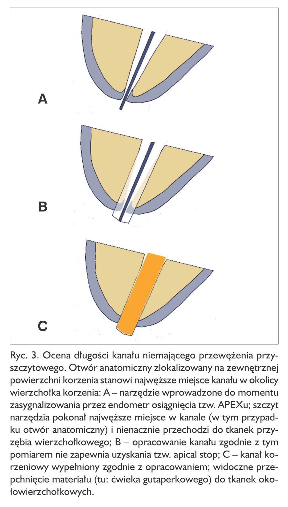 Niezwykle istotne jest, by podczas dokonywania pomiaru wprowadzić narzędzie do kanału do momentu uzyskania wskazania APEX. W takim momencie bowiem uzyskany wynik jest miarodajny i oznacza, że wierzchołek narzędzia pokonał przewężenie przyszczytowe kanału. W chwili, gdy uzyska się wskazanie APEX, należy zatem nieco wycofać narzędzie z kanału, gdyż gdyby opracować kanał zgodnie z takim wskazaniem, doszłoby do zniszczenia przewężenia kanału. Jeśli odległość między otworem anatomicznym a przewężeniem przyszczytowym byłaby niewielka lub te dwie struktury pokrywałyby się, to istnieje prawdopodobieństwo, że narzędzia używane podczas opracowania były wprowadzane do tkanek przyzębia (ryc. 3).