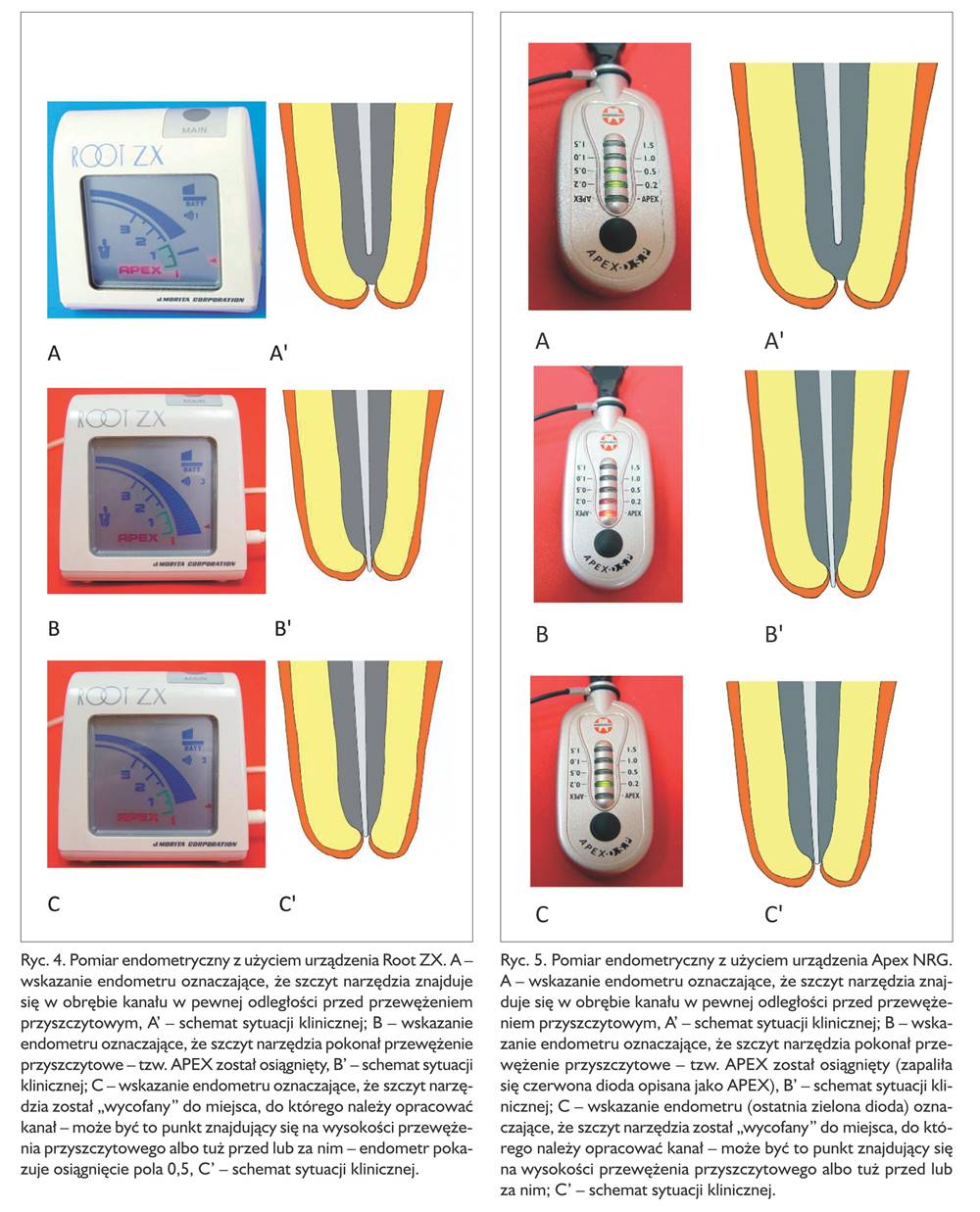 Jak już podkreślono, w przypadku każdego urządzenia miejsce to jest w konkretny sposób oznaczone i opisane przez producenta w instrukcji obsługi. zamiast wycofywania narzędzi w celu uzyskania odpowiedniego wskazania można również zmierzyć długość narzędzia w momencie zasygnalizowania przez endometr osiągnięcia tzw. APEXu i tak określoną długość pomniejszyć o 0,5‑1 mm – by uzyskać długość roboczą (1).