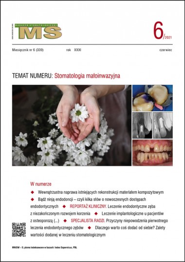 tematem miesiąca czerwcowego numeru „Magazynu Stomatologicznego” jest STOMATOLOGIA MAŁOINWAZYJNA. Znajdą w nim Państwo dwie prace – pierwsza z nich prezentuje możliwości i ograniczenia wykonania napraw istniejących rekonstrukcji kompozytowych oraz ceramicznych, druga zaś stanowi krótki przegląd nowych koncepcji stwarzania dostępu do jamy zęba podczas leczenia endodontycznego.
