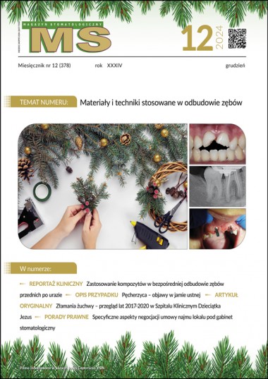 tematem miesiąca grudniowego numeru „Magazynu Stomatologicznego” są: MATERIAŁY I TECHNIKI STOSOWANE W ODBUDOWIE ZĘBÓW. Znajdą w nim Państwo trzy prace; jedna z nich opisuje odbudowę koron uszkodzonych zębów siecznych, druga przybliża właściwości i kryteria wyboru materiału w zależności od sytuacji klinicznej oraz jego zastosowanie, trzecia zaś to kolejna część reportażu prezentująca augmentację wąskich wyrostków zębodołowych z zastosowaniem dwufazowego siarczanu wapnia.